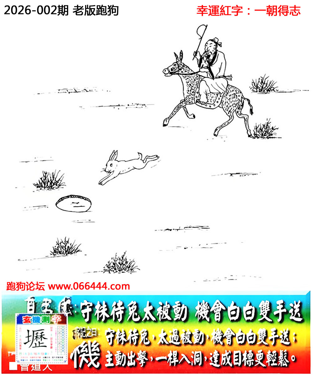 002期老版跑狗一字記之曰:【機】 詩雲:守株待兔太被動,機會白白雙手送。 守株待兔,太過被動,機會白白雙手送; 主動出擊,一桿入洞,達成目標更輕鬆。 玄機測字:《壢》