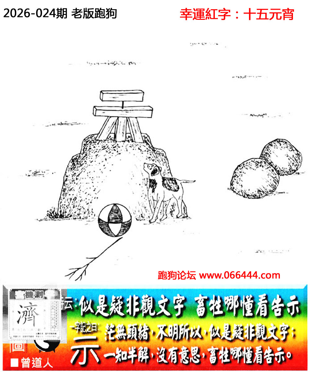 024期老版跑狗一字記之曰:【示】 詩雲:似是疑非觀文字,畜牲哪懂看告示。 茫無頭緒,不明所以,似是疑非觀文字; 一知半解,沒有意思,畜牲哪懂看告示。 玄機測字:《濟》